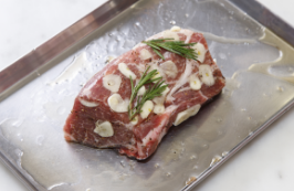 豚肉に、塩・黒こしょうし、はちみつをぬって、にんにくスライス・ローズマリーをのせ、15~20分おく。