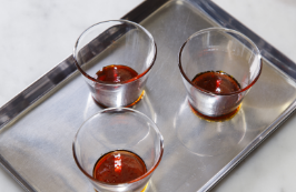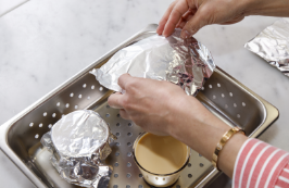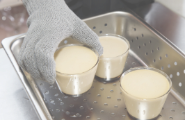 ガラスカップに、155gずつ流し入れ、表面に出来た泡は取り除き、アルミホイルで蓋をする。