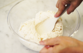 生地を25℃位にもどし、やさしく混ぜ、メジャーカップに入れる。