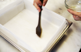 ・カヌレ型に、やわらかくしたバターをハケでむらなくうすくぬっておく。