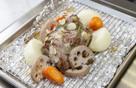 ホテルパンにアルミホイル・アミの順にのせ、1の豚肉をのせ、周りにれんこん・にんじん・玉ねぎを並べ、全体にオリーブオイルをかける。