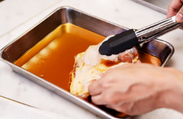 鶏もも肉を塩・しょう油・白ワイン・みりんを合わせたものに30分つけておく。
