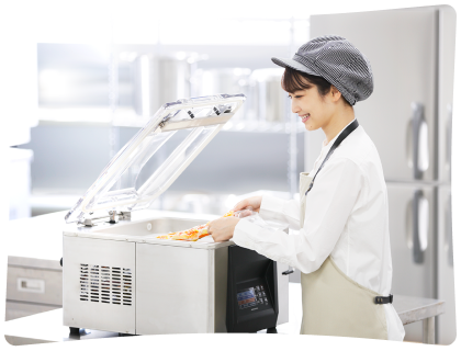 調理後、すぐ冷凍保存することで、風味の劣化を抑えることができます。冷凍保存の際は、真空包装機とブラストチラーがあると便利。空き時間にまとめて調理しておけば、調理の効率化が図れます。