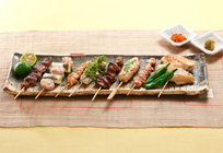 焼き鳥(鶏皮、手羽先、つくね、ねぎま、はらみ、レバー、砂肝、ささみ梅しそ)