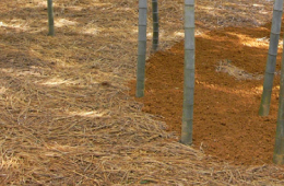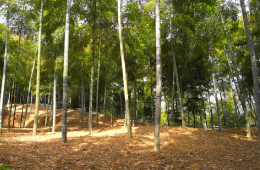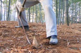 たけのこ畑の手入れは、1年間休むひまがありません。収穫の時期には、将来、たけのこを生むために残す「親竹」を選び、初夏の頃からは、肥料を撒いたり、親竹が大きくなりすぎないように竹の先端を折ったり、親竹に栄養を行き渡らせるために間引きをしたりという作業がおこなわれます。親竹同士は2m以上の間隔を保ち、また高さも抑えられているため、たけのこ畑には十分な太陽光が差し込み、親竹に十分な栄養を送り込むことができるのです。栄養が十分行き渡った土壌は当然、ほかの植物たちにも好条件となり、たくさんの雑草も生えるため、こまめな草引きもかかせません。秋以降には、仕上げの土壌作りが始まります。たけのこ畑一面にわらを敷き詰め、その上に薄く赤土をかぶせていきます。わらを敷くことで土の中に空気の層を作るだけでなく、わら自体がやがて肥料にもなります。さらに、赤土の保温・保水効果により、たけのこの成長を促していくのです。できあがった土壌は一歩踏み入れると足が沈むほどにふかふかしています。京たけのこの特長である肉質がやわらかく、姿の美しいたけのこは、この土壌作りから生まれるといっても過言ではないでしょう。