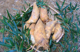 京たけのこのおいしさの秘密は、収穫の方法にもあります。たけのこは日に当たると乾燥して味が落ちてしまうため、夜明け前に土の中にある状態から掘り出されます。赤土の表面にわずかにできたひび割れからたけのこの場所をみつけだし、「ほり」という刃の長い独特の鍬で掘り出していきます。たけのこの先が少し見えるくらいに土をかきだし、それを見て地下茎とたけのこの位置を判断します。そして、ほりを土中に入れ、たけのこを傷つけないように地下茎と切り離して、掘り出すのです。こうして掘り出されたたけのこは、野に生えるたけのこと違い、全体的に白っぽい色をしています。